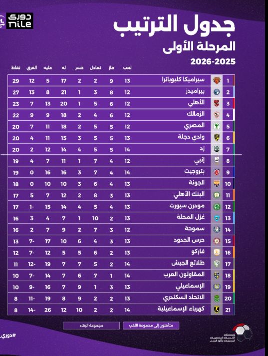 نشرت الصفحة الرسمية لرابطة الأندية المحترفة جدول ترتيب فرق الدورى قبل استئنافه بعد فترة التوقف الدولى بسبب بطولة أمم أفريقيا التى أقيمت فى المغرب.