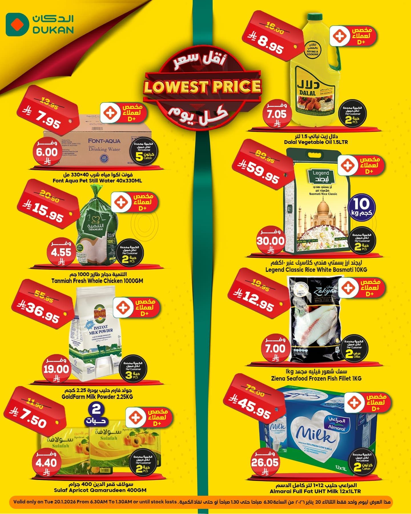 بنقدم ليكم احدث الدكان بتاريخ الثلاثاء 20 يناير 2026 الموافق 30 رجب 1447هـ و تحتوي علي تشكيلة من المنتجات الغذائية الاساسية منها الارز و زيوت الطعام و السكر و المجمدات و غيرها من المنتجات و بارخص الاسعار المناسبة للجميع تابعونا علي موقع عروض توداي ليصل اليكم كل جديد عن عروض