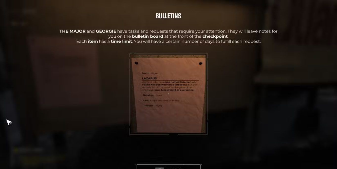تعتمد مهام Bulletin Board على تكليف اللاعب بالبحث عن أشخاص محددين أو عناصر محظورة أثناء عمليات الفحص والتحقيق وهو ما يتطلب مستوى أعلى من التركيز والانتباه لكل التفاصيل أثناء التعامل مع الناجين حيث لا تقتصر المهمة على الفحص الصحي فقط بل تمتد إلى التحقق من الهوية والسلوك والمقتنيات.