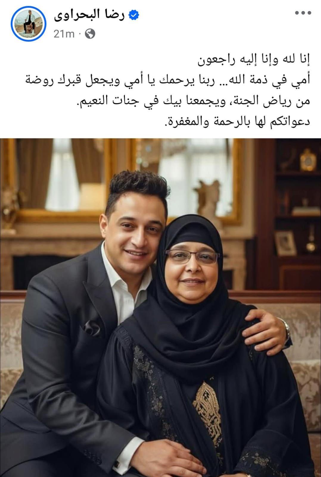 الثلاثاء، 20 يناير 2026 07:23 صكشفت الصفحة الرسمية للفنان رضا البحراوي عن وفاة والدته، حيث نشر على الصفحة منشور جاء فيه، "إنا لله وإنا إليه راجعون أمي في ذمة الله… ربنا يرحمك يا أمي ويجعل قبرك روضة من رياض الجنة، ويجمعنا بيك فى جنات النعيم.. دعواتكم لها بالرحمة والمغفرة".