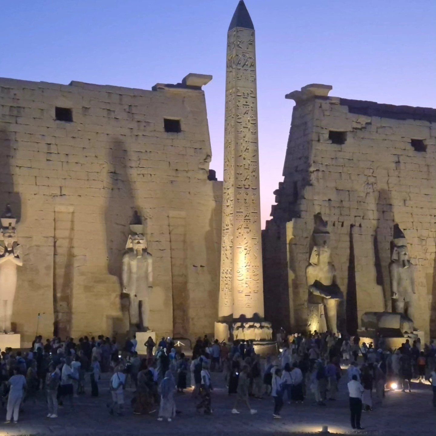 ومن جانبه يقول أحمد عربى مدير عام معبد الأقصر، إنه بعد قرار مد فترات العمل بالإضاءة الليلية للمعبد لتشجيع زيارات السياح في فترات الصيف، حقق معبد الأقصر حالة من الإقبال السياحية الكبيرة من الأجانب القادمين من حول العالم، موضحاً إنه فى "1390-2353 ق.م" بنى المعبد أمنحتب الثالث، وجاء بعده الملك رمسيس الثانى الذى أضاف فى الفناء الأعمدة والبيلون المدخل الأول، فأصبح يحتوى على مدخل وبرجين، وكل برج فى شكل منحرف وأمامه تمثالان جالسان لرمسيس وبجانبهما أربعة تماثيل واقفة، وتمت إعادة إثنين منهما لموقعهما بعد تحطمهما فى العصور السابقة، موضحاً إنه داخل المعبد توجد مسلة بناها رمسيس الثانى لتصوير إنجازاته الحربية وانتصاره على الأعداء فيها، وهى عبارة عن البرج الأول بارتفاع 24 مترًا (79 قدمًا)، بناه رمسيس الثانى وزين البرج بمشاهد انتصارات رمسيس العسكرية فى (معركة قادش)، كما سجلت انتصارات الفراعنة فى وقت لاحق، وانتصارات الأسرة 25 (السلالة النوبية).