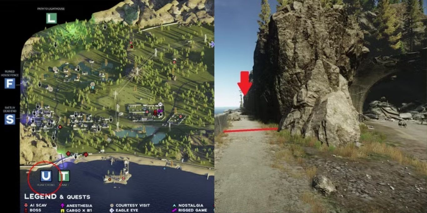 يمكن العثور على هذه النقطة بسهولة نسبيًا عبر اتباع الشاطئ في الاتجاه المعاكس للميناء الرئيسي ومنطقة المرفأ حتى الوصول إلى حافة الخريطة. تُميَّز نقطة الاستخراج بعدة درجات صغيرة تؤدي إلى خارج الخريطة، ويُعد Tunnel المعلم الأبرز عند البحث عن هذا المخرج. بعد الوصول إلى النفق، يتعيّن تجاوز الصخرة العالية التي تفصل طريق النفق عن الطريق الساحلي الأصغر والأضيق الواقع إلى الجهة اليسرى.