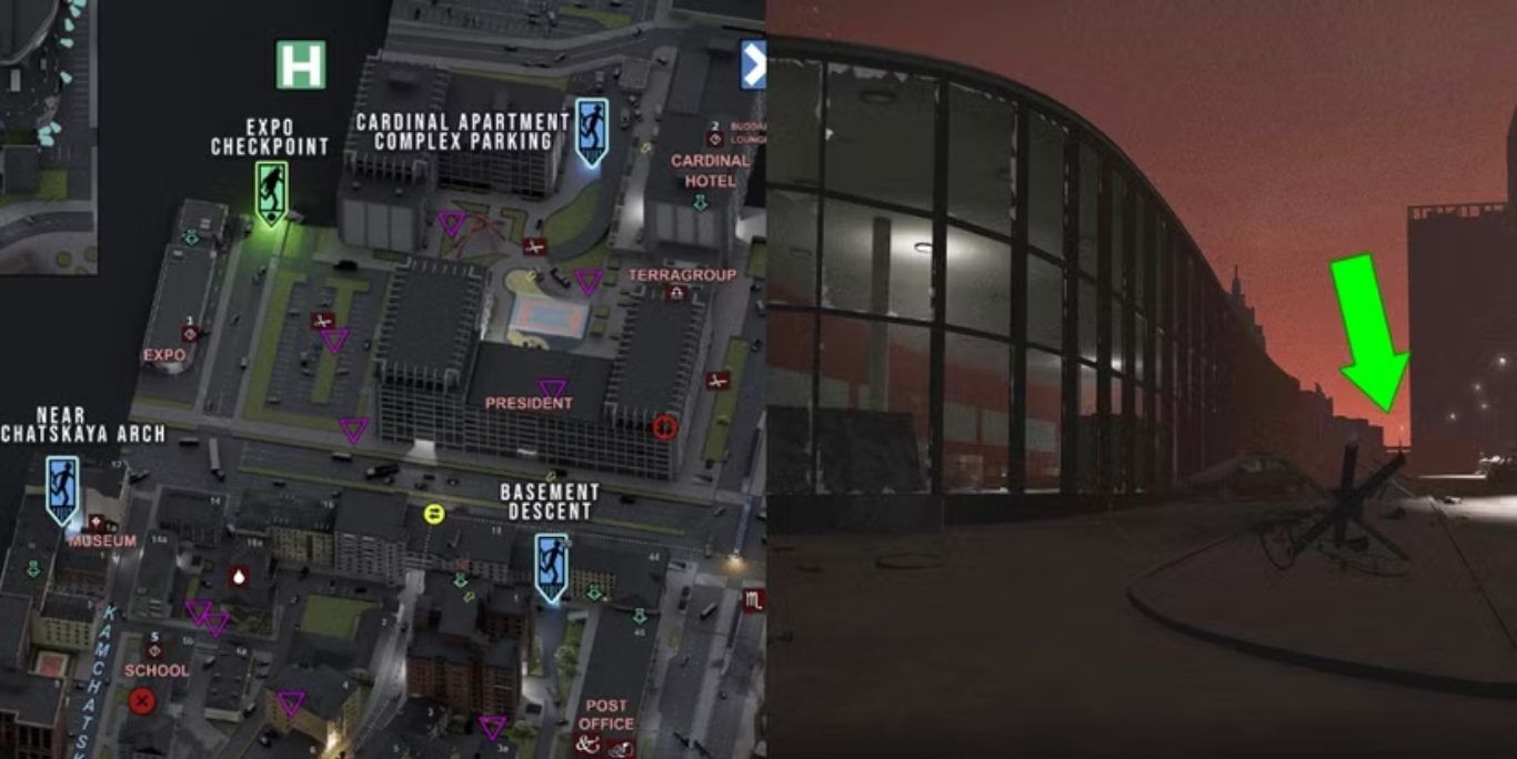 تُعد نقطة الاستخراج Basement Descent واحدة من أكثر نقاط الاستخراج تمركزًا في وسط الخريطة، إذ تقع داخل ساحة صغيرة خلف مكتب البريد في Primorsky Avenue. يمكن الوصول إلى المنطقة من عدة اتجاهات عبر المرور بين المتاجر أو اتباع الطرق المختلفة التي تتقاطع بين مباني الشقق.