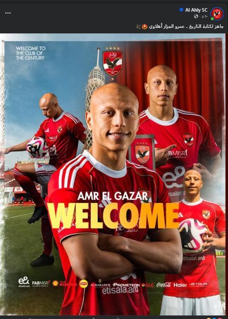 الأربعاء، 21 يناير 2026 07:15 مأعلن النادى الأهلى عبر صفحته الرسمية بموقع التواصل الأجتماعى فيس بوك التعاقد مع عمرو الجزار مدافع فريق البنك الأهلى خلال فترة الانتقالات الشتوية الحالية.ونشرت الصفحة الرسمية صورة للاعب وجاء التعليق عليها " جاهز لكتابة التاريخ".ونجح مسئولى النادى الأهلى من الحصول على عمرو الجزار من البنك الأهلى لمدة 4 سنوات ونصف وتعد الصفقة الثانية للفريق الأحمر عقب مروان عثمان مهاجم فريق سيراميكا.