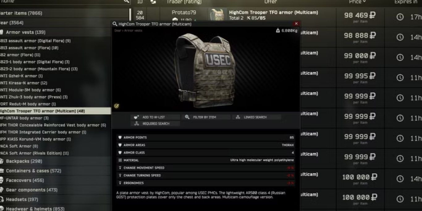 يظل درع Highcom Trooper الكلاسيكي الذي اشتهر بانتشاره بين Raiders أو حراس زعماء Scav درعًا مفيدًا للغاية. يوفر المستوى الرابع حماية كافية ضد أغلب أنواع الذخيرة. يفرض تأثيرات سلبية محدودة على سرعة الالتفاف وسرعة الحركة ومستوى ergonomics بفضل تصنيعه من بولي إيثيلين فائق الخفة. يتمتع بمتانة مرتفعة تصل إلى 85 نقطة مقارنة بالدروع الأرخص مثل NFM Thor Concealable التي تبلغ 35 نقطة فقط. يمكن العثور عليه في Flea Market.