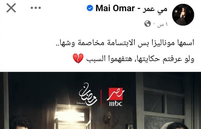 ونشرت مي عمر، صورة بوستر مسلسل الست موناليزا، عبر حسابها الشخصي بموقع التواصل الاجتماعي فيسبوك، وعلقت قائلة: "اسمها موناليزا بس الابتسامة مخاصمة وشها.. ولو عرفتم حكايتها، هتفهموا السبب".