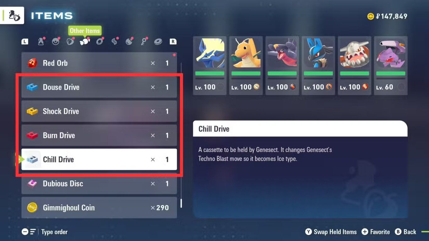 طريقة استخدام Chill Drive و Douse Drive و Shock Drive و Burn Drive مع Genesect في لعبة Pokemon Legends Z A Mega Dimension