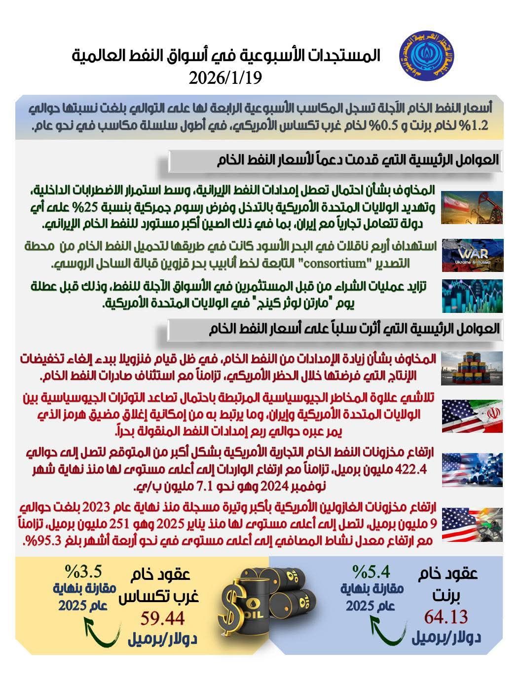 الخميس، 22 يناير 2026 03:30 صنشرت منظمة الأقطار العربية المصدرة للبترول، "أوابك"، المستجدات الأسبوعية بأسواق النفط العالمية، حيث سجلت أسعار النفط الخام الأجلة المكاسب الأسبوعية الرابعة لها على التوالى بلغت نسبتها حوالى %1.2 لخام برنت و0.5% لخام غرب تكساس الأمريكى، فى أطول سلسلة مكاسب فى نحو عام.