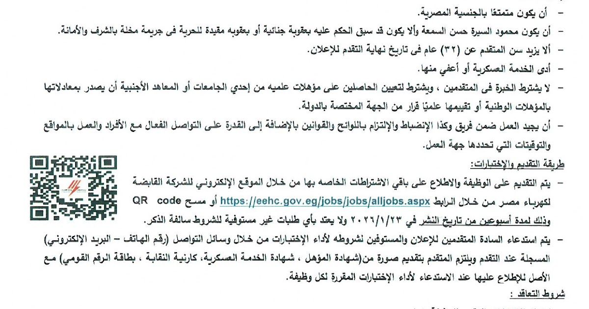 وظائف خالية بالشركة القابضة لكهرباء مصر تعلن الشركة عن حاجة شركات توزيع الكهرباء التابعة لشغل عدد من الوظائف الهندسية والتخصصية والفنية " ذكور" في مجال جودة التغذية الكهربية وتخطيط شبكات التوزيع وتركيب وتشغيل منظومة العدادات الذكية والبنية التحتية وأمن المعلومات بمراكز البيانات وذلك في المناطق المستهدف تركيب منظومات العدادات الذكية بها على مستوى الجمهورية سيتم فتح باب التقديم إعتباراً من صباح يوم الجمعة الموافق 23/01/2026 حتى مساء يوم الخميس الموافق 05/02/2026
