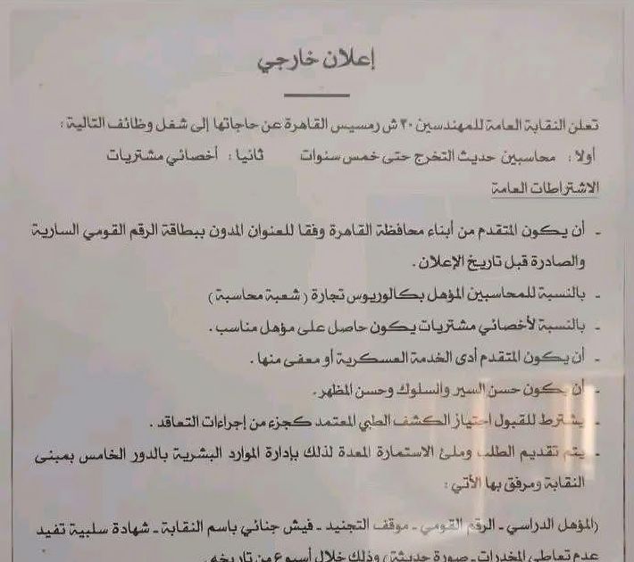 إعلان خارجي تعلن النقابة العامة للمهندسين ٢٠ ش رمسيس القاهرة عن حاجاتها إلى شغل