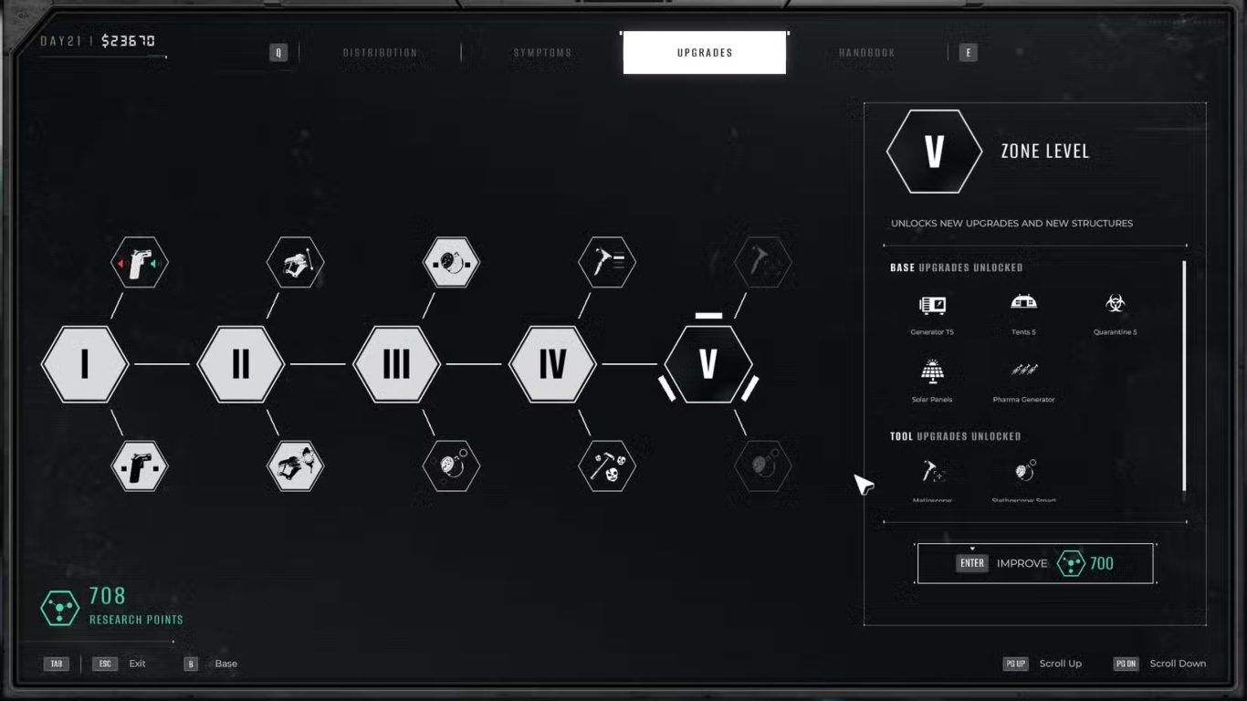 لإجراء الترقيات يحتاج اللاعب إلى جمع Research Points وهي المورد الأساسي المستخدم لشراء التحسينات ورفع Zone Level. يسمح رفع Zone Level بفتح ترقيات إضافية وأدوات أكثر تطورًا إضافة إلى تحسينات مرتبطة بالأسلحة وأنظمة الأمان. كل مستوى جديد يفتح خيارات أوسع ويغير أسلوب التعامل مع الناجين بشكل ملحوظ.