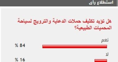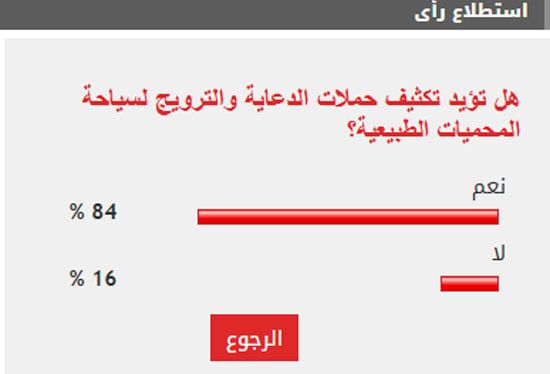 وأيد 84% من القراء مطالب تكثيف حملات الدعاية والترويج لسياحة المحميات الطبيعية، بينما عارض 16% من القراء مطالب تكثيف حملات الدعاية والترويج لسياحة المحميات الطبيعية.
