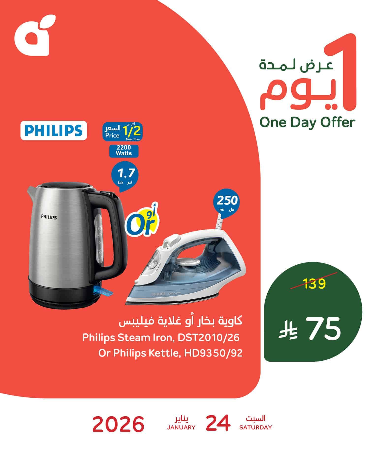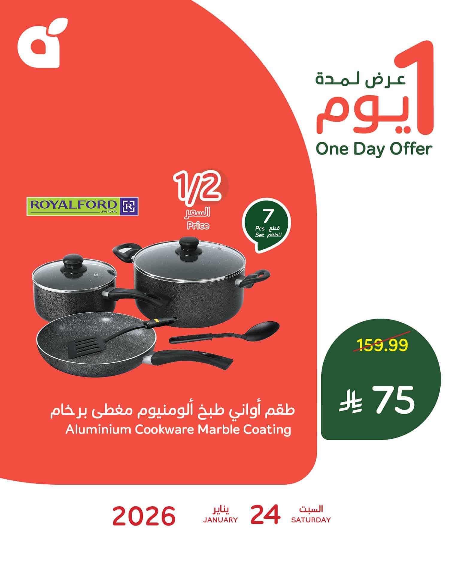 نقدم لكم احدث بنده السبت 24 يناير 2026 الموافق 5 شعبان 1447هـ و تحتوي علي تشكيلة من افضل الادوات و الاجهزة المنزلية في عرض حصري متاح اليوم فقط و بنصف السعر منها طقم اواني طبخ بالاضافة الي كاوية بخار و باسعار تنافسية ابقوا معنا علي موقعكم عروض توداي ليصل اليكم كل جديد