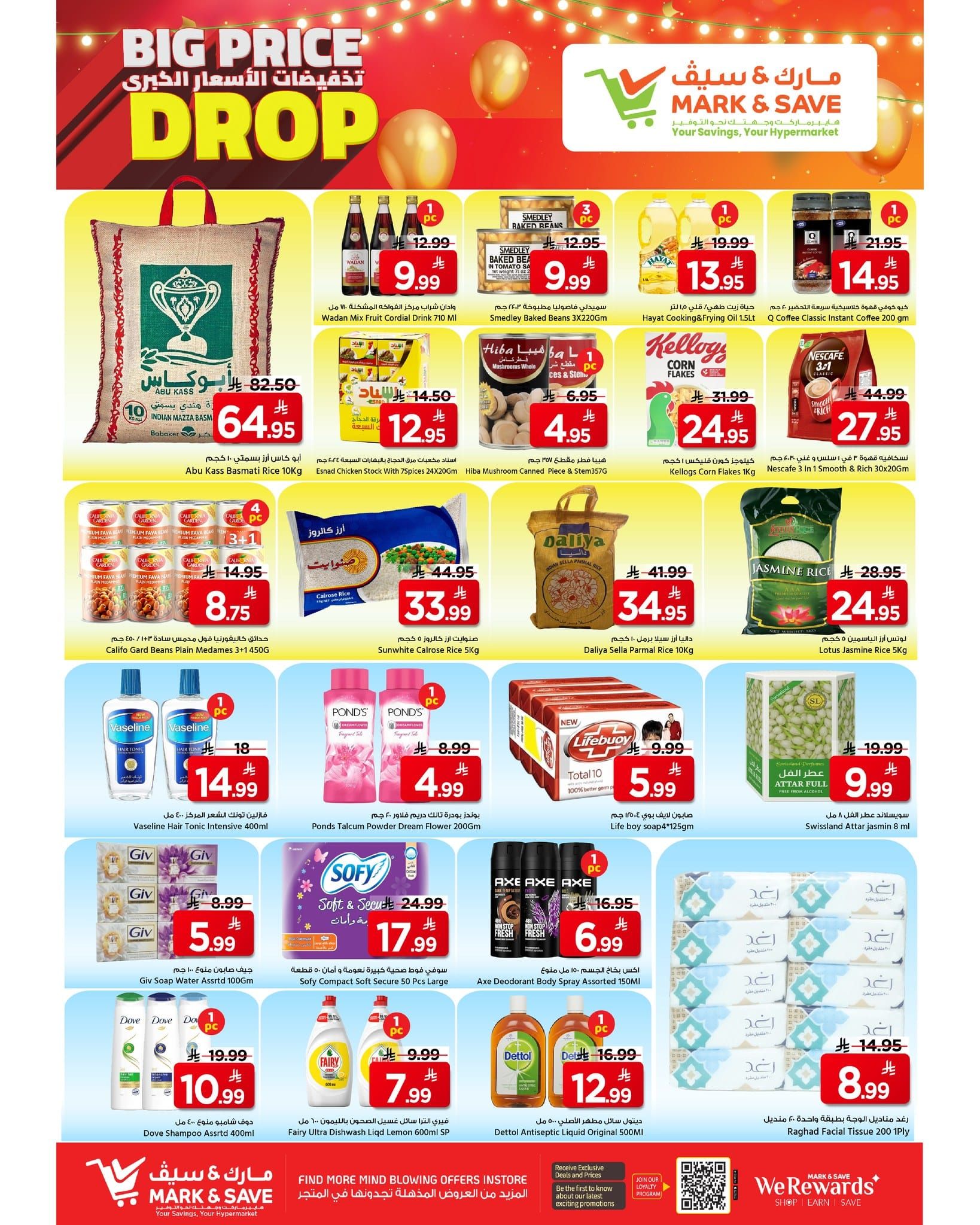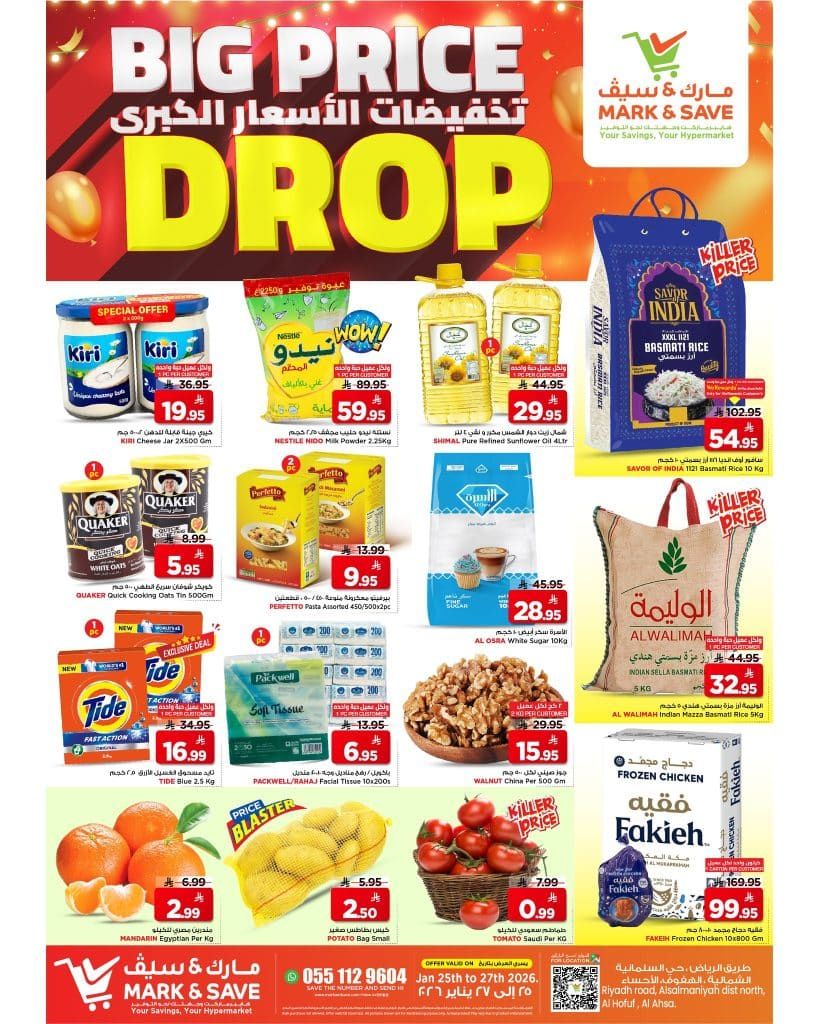 عروض مارك اند سيف الاحساء الاحد 6-8-1447هـ – 25 يناير 2026 تحتوي علي الأرز والبسكويت والحبوب والعصائر والزيوت والسوائل المنظفة والمناديل والصابون والمشروبات الغازية بجانب ذلك بتوفر كمان منتجات التنظيف والعناية والأغذية الأساسية إضافة إلى مساحيق الغسيل والمكسرات والفواكه والخضروات والدجاج المجمد