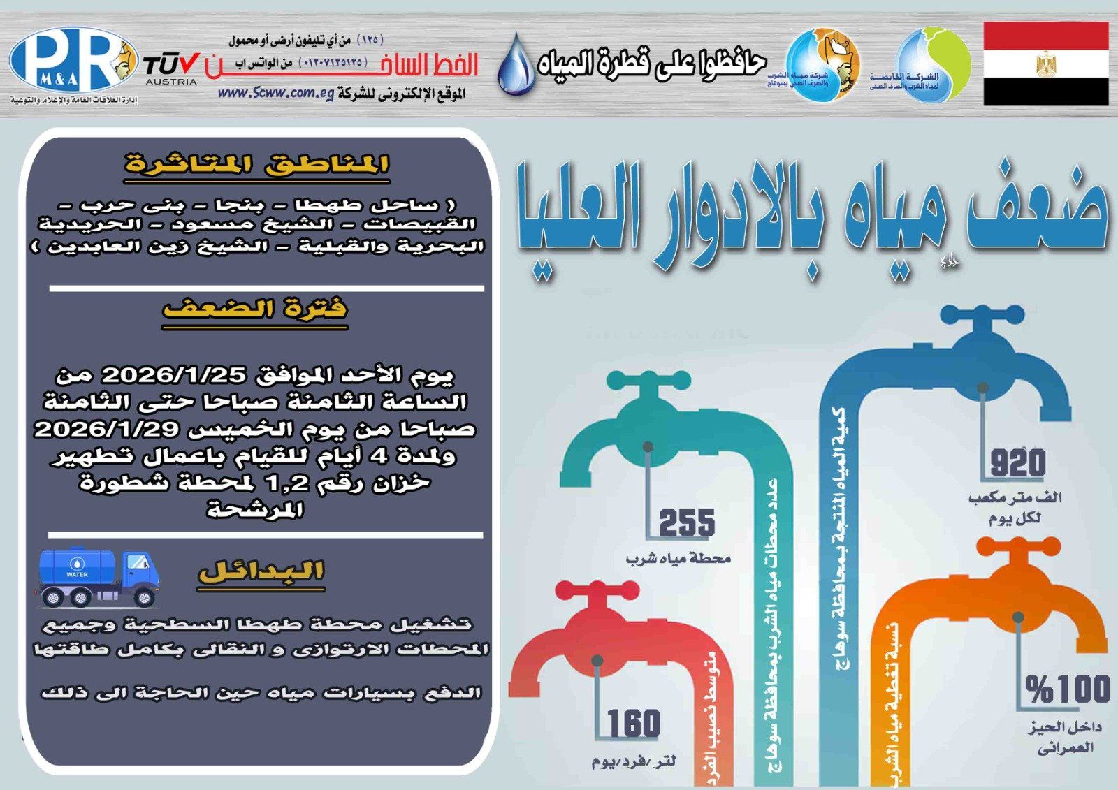 السبت، 24 يناير 2026 11:16 صأعلنت شركة مياه الشرب والصرف الصحى بسوهاج عن ضعف المياه بالأدوار العليا بقرى ساحل طهطا و بنجا و بنى حرب والقبيصات والشيخ مسعود والحريدية القبلية والبحرية والشيخ زين العابدين غدا الأحد الموافق 25 يناير 2026 فى تمام الثامنة صباحا وحتى الثامنة صباحا من يوم الخميس الموافق 29 يناير 2026 ولمدة 4 أيام ..صرح بذلك المهندس محمد صلاح الدين عبد الغفار رئيس مجلس الإدارة والعضو المنتدب وأضاف أنه يتم خلال تلك الفترة القيام باعمال تطهير خزان رقم 1, 2 لمحطة شطورة المرشحة.