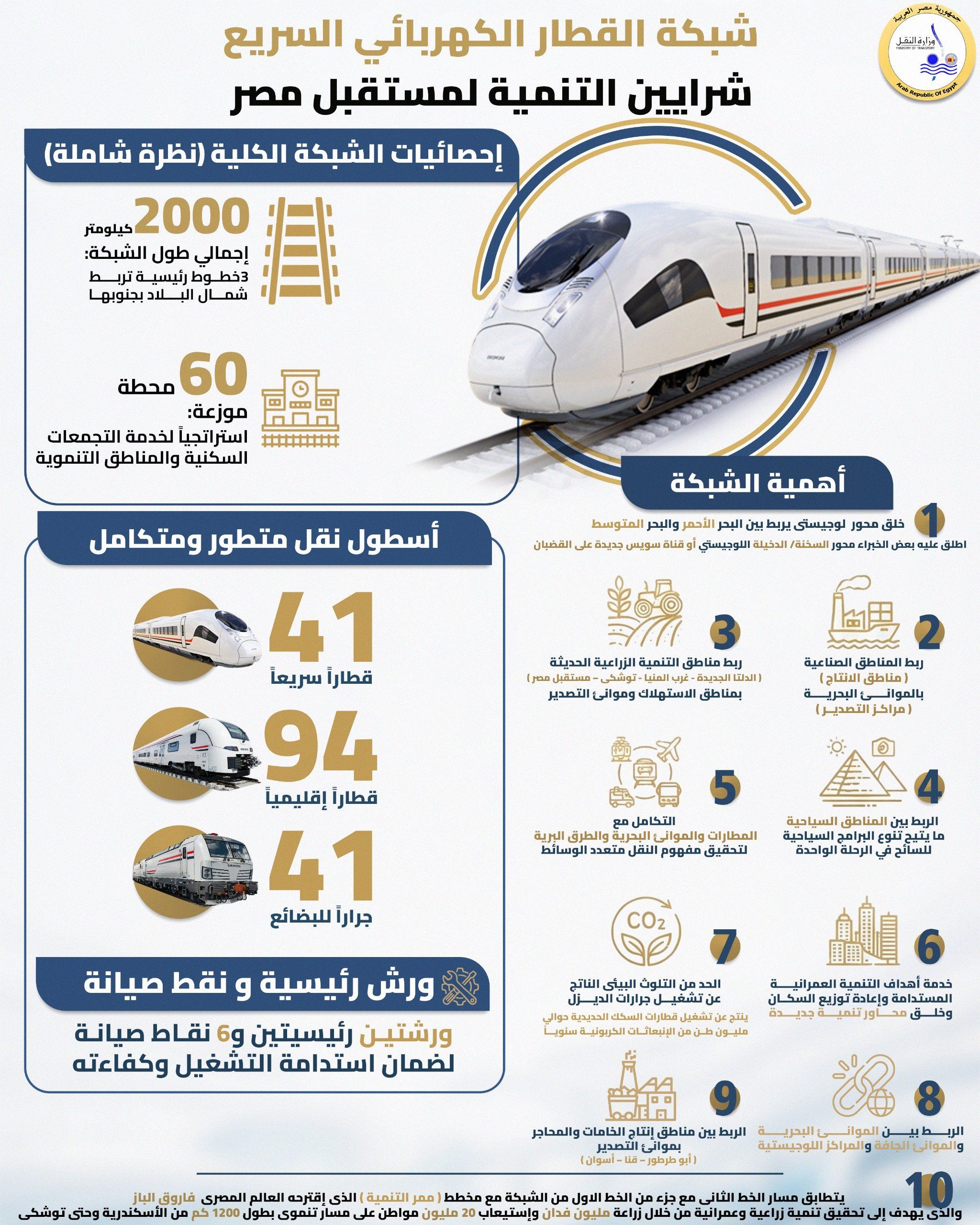 السبت، 24 يناير 2026 01:33 متُعد شبكة القطار الكهربائي السريع نقلة نوعية في منظومة النقل المصري، حيث تمثل "قناة سويس جديدة على القضبان" تربط أطراف الدولة وتدعم خطط التنمية المستدامة.