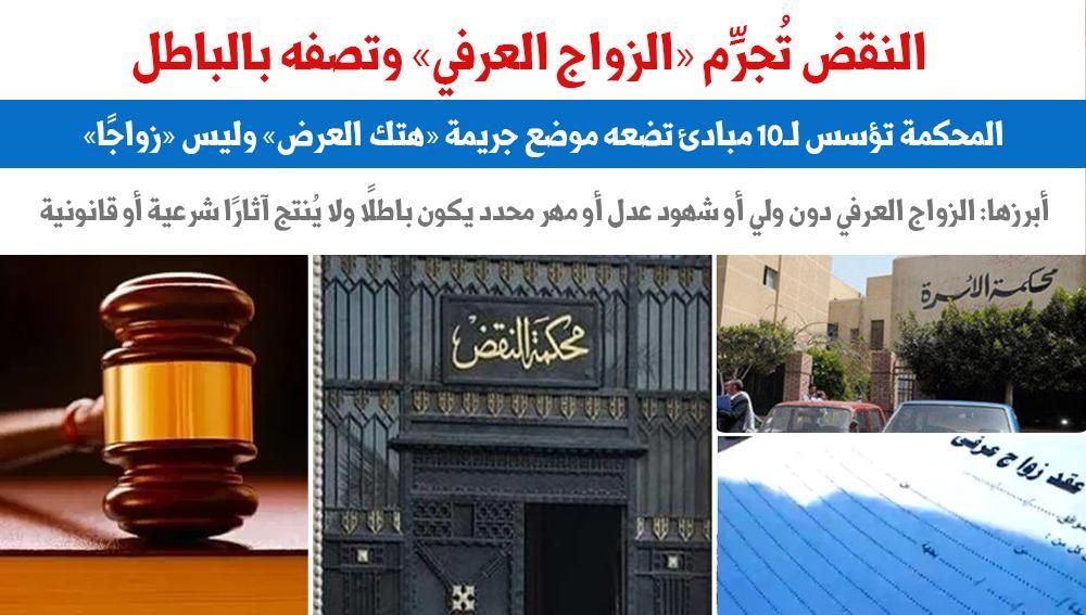 النقض تُجرم "الزواج العرفى" وتصفه بالباطل.. وتؤسس لـ10 مبادئ تضعه موضع جريمة "هتك العرض" وليس "زواجاً".. أبرزها: الزواج العرفي بدون ولي أو شهود عدل أو مهر محدد يكون باطلاً ولا ينتج آثارًا شرعية أو قانونية