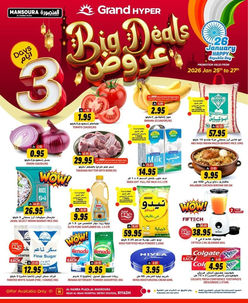 عروض جراند هايبر الرياض 25 يناير 2026 تخفيضات 3 ايام فقط جميع المنتجات التي تبحثون عنها بأفضل الاسعار الان متوفره في فرع جراند هايبر ماركت – الحمراء بلازا المنصورة مخرج 21 الرياض و التي تقدم لكم اسعار منافسة و منتجات متنوعة لا تفوتوا التخفيضات من 25 حتى 27 يناير 2026 فقط.
