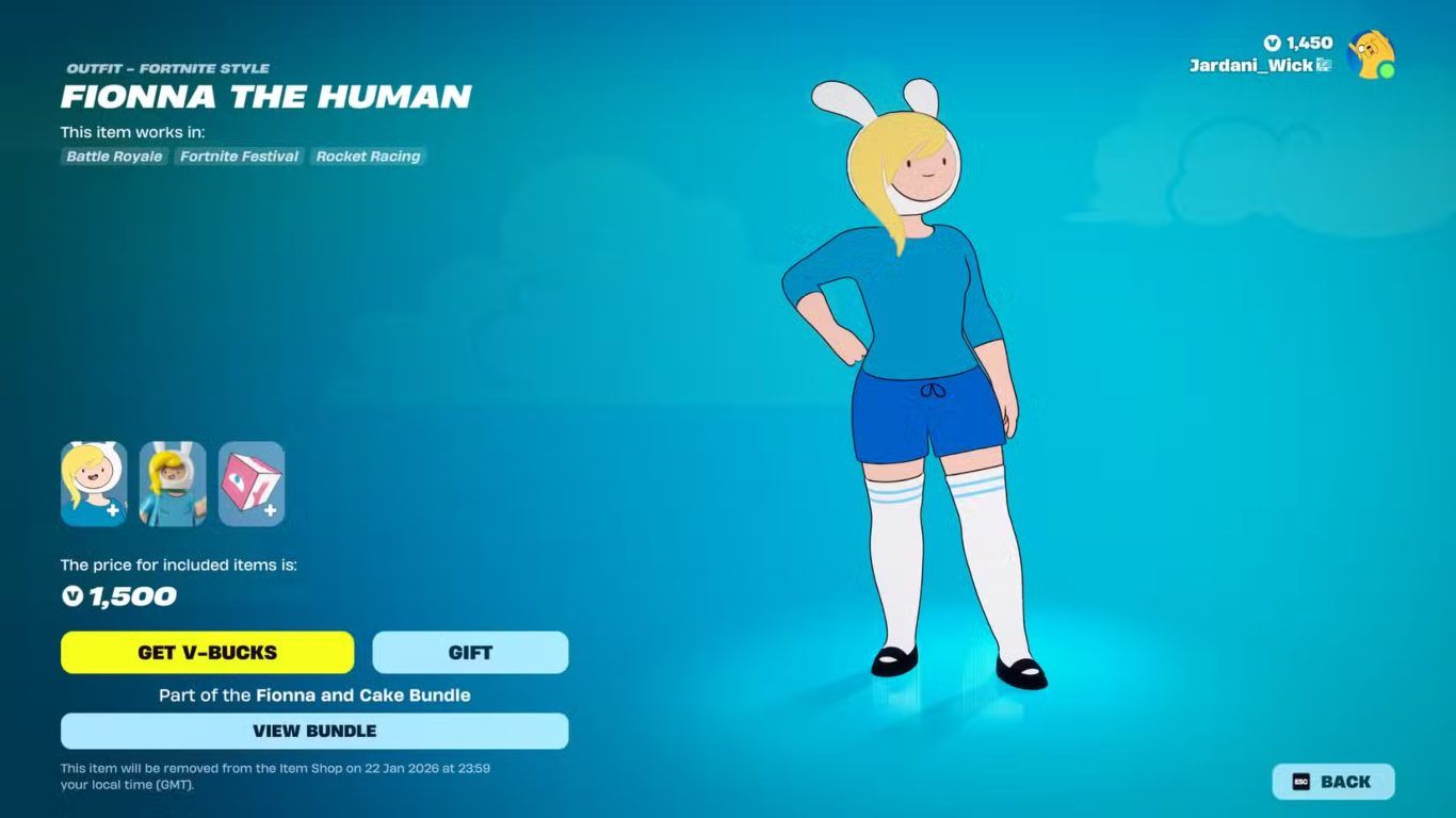 تعد شخصية Fionna the Human واحدة من الشخصيات القادمة من عالم Adventure Time داخل لعبة Fortnite حيث تم تقديمها كزي مستقل يمكن للاعبين الحصول عليه مباشرة من المتجر مقابل 1500 V Bucks.