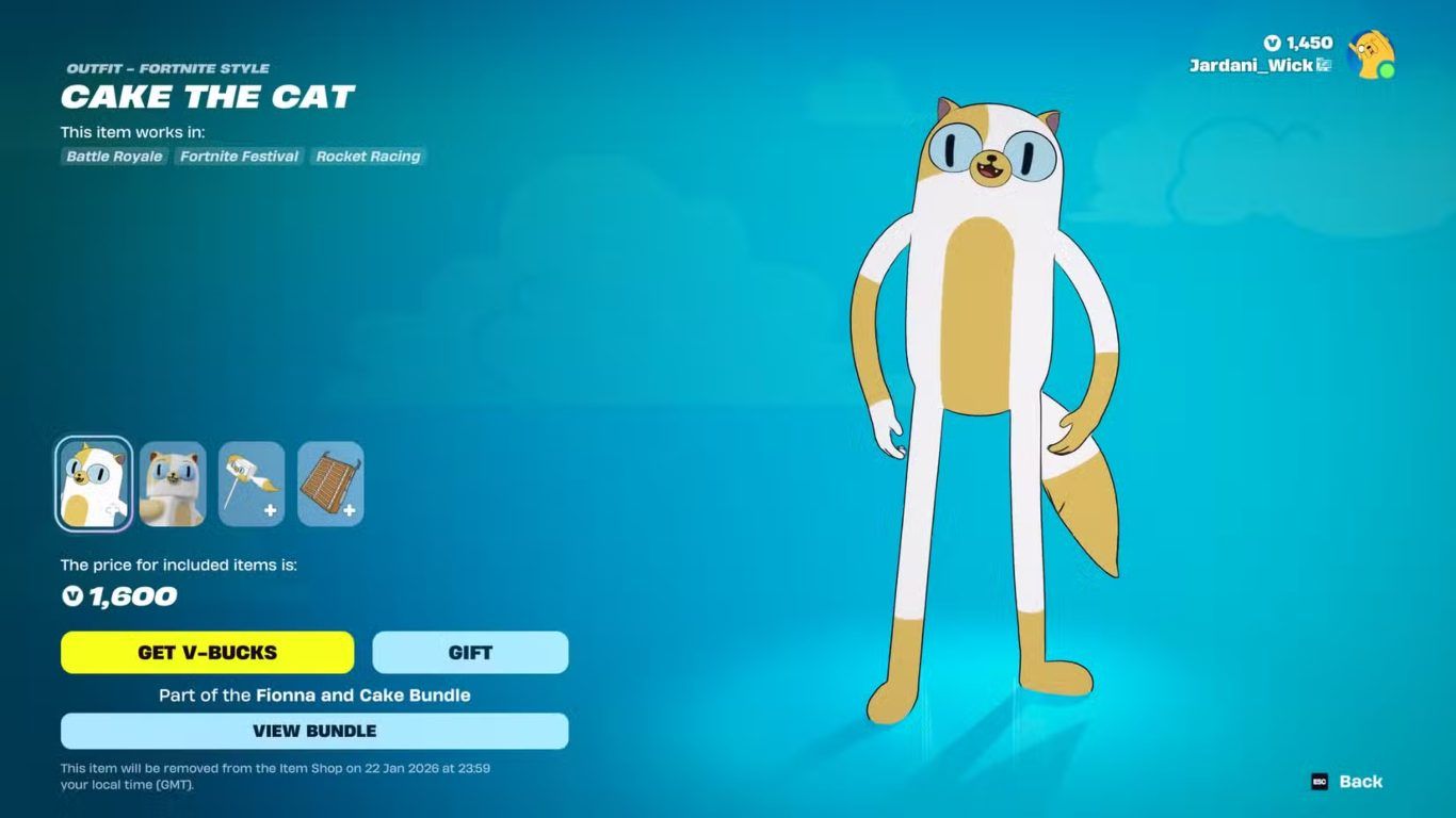 تعد شخصية Cake the Cat واحدة من الشخصيات المميزة القادمة من عالم Adventure Time داخل لعبة Fortnite حيث يمكن للاعبين الحصول على هذا الزي مباشرة من المتجر مقابل 1600 V Bucks.