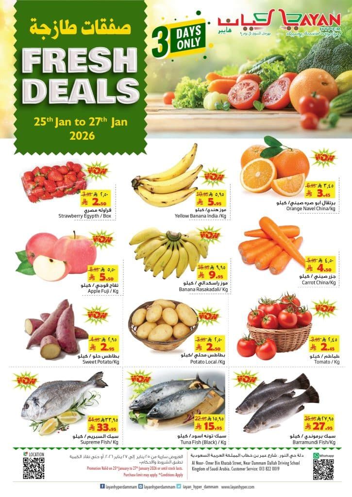 عروض ليان هايبر ماركت الاحد 6 شعبان 1447هـ الموافق 25-1-2026 و تشمل اليوم تشكيلة من الخضروات الطازجة و الفواكه الطازجة بالاضافة الي الاسماك و اللحوم الشهية و باسعار مناسبة للجميع لمدة 3 ايام و يمكنكم متابعتنا لمعرفة كل جديد عن عروض السعودية