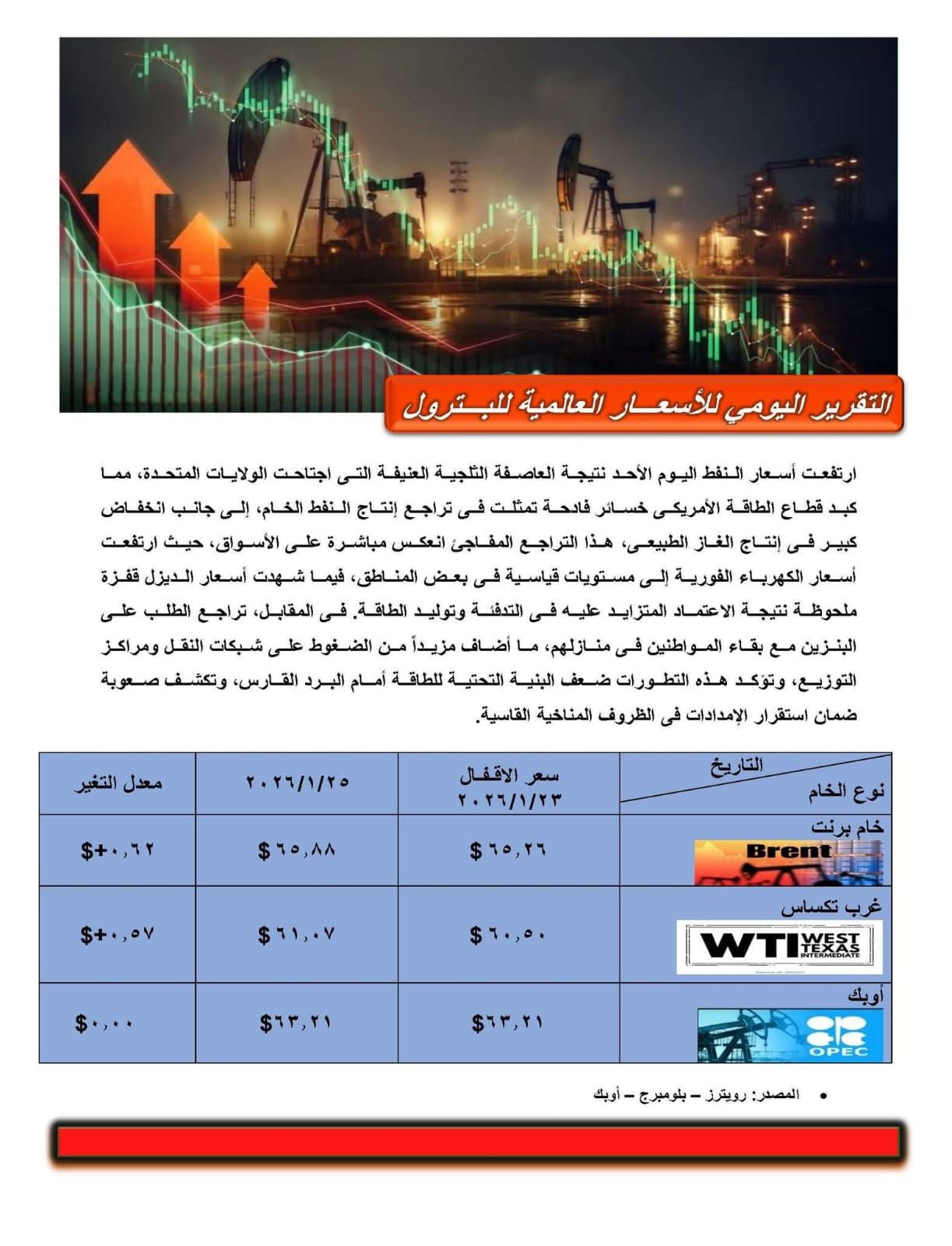 نشرت الهيئة المصرية العامة للبترول على صفحتها بمواقع التواصل الاجتماعى الأسعار العالمية للبترول اليوم الأحد الموافق 25-1-2026.