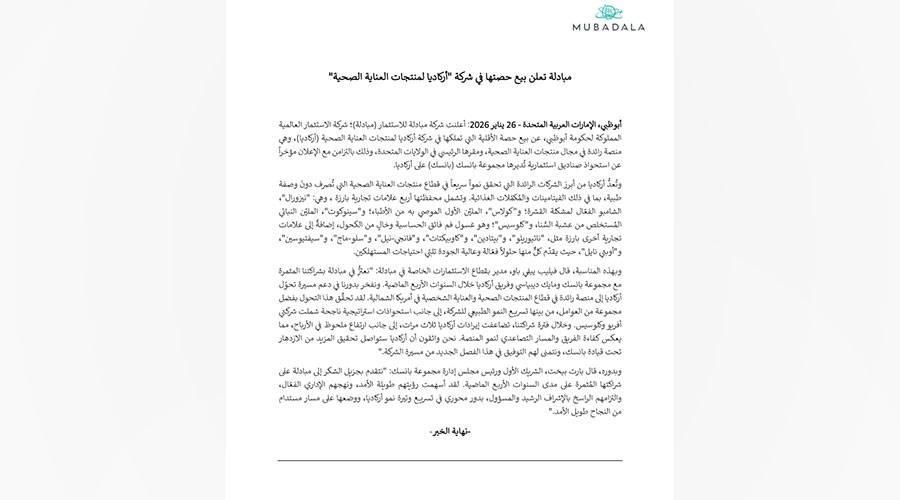 أعلنت شركة مبادلة للاستثمار «مبادلة» ، بيع حصة الأقلية التي تملكها في شركة أركاديا لمنتجات العناية الصحية «أركاديا»، ومقرها الرئيسي في الولايات المتحدة، وذلك بالتزامن مع الإعلان مؤخراً عن استحواذ صناديق استثمارية تُديرها مجموعة بانسك على أركاديا.