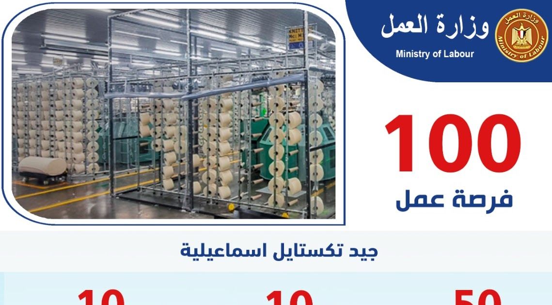 تنفيذًا لتوجيهات معالي وزير العمل محمد جبران، بتكثيف جهود الوزارة لتوفير فرص عمل لائقة للشباب وتعزيز التعاون مع مؤسسات القطاع الخاص، تُعلن وزارة العمل عن توافر 100 فرصة عمل جديدة بإحدى شركات الغزل والنسيج داخل المنطقة الحرة العامة بالإسماعيلية «200 فدان»، وذلك بالتنسيق مع شركة جيد تكستايل الإسماعيلية. وتشمل