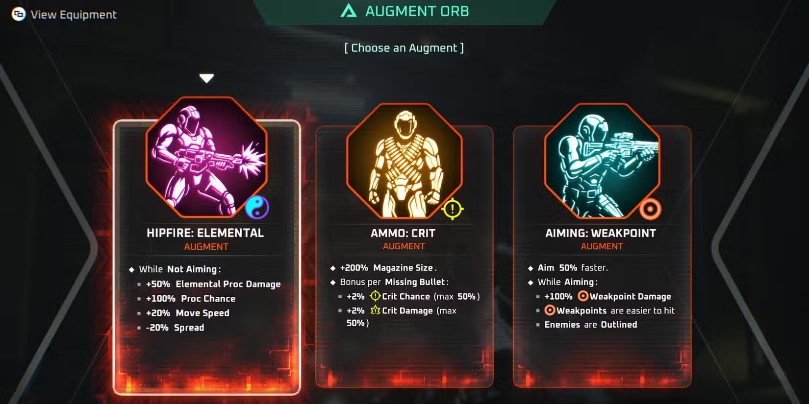 تُعد Augments من أوائل التعزيزات التي يحصل عليها اللاعب داخل Deadzone Rogue، وتمثّل الأساس الذي يُبنى عليه أسلوب الشخصية. تتوافر عند وقت الكتابة ثلاثة خيارات وهي Hipfire: Elemental و Ammo: Crit و Aiming: Weakpoint. يُعد اختيار Hipfire: Elemental هو الخيار الأنسب، إذ يمنح زيادة بنسبة خمسين في المئة في ضرر تفعيل العناصر، وزيادة بنسبة مئة في فرصة التفعيل، مع زيادة مقدارها عشرون في سرعة الحركة، وتقليل بنسبة عشرين في المئة من تشتت الإطلاق من دون تصويب.