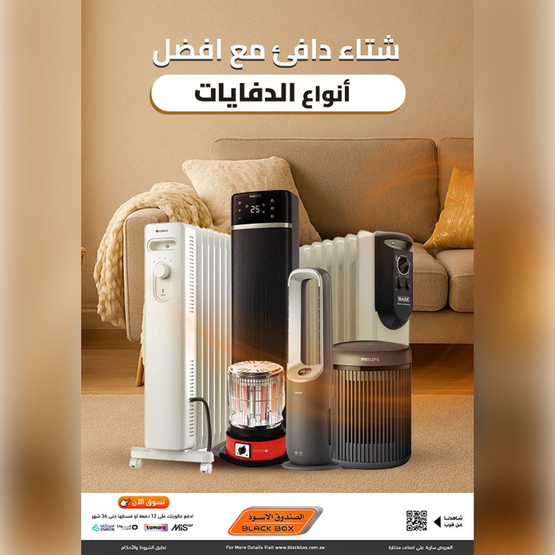 عروض الصندوق الاسود بتقدم ليكم هذا الاسبوع تشكيلة من افضل انواع الدفايات منها الغاز و ايضا يتوفر دفايات زيت و يمكنك الان الاستمتاع بشتاء دافئ مع مميزات مختلفة حيث يمكنك الشراء و التقسيط حتي 12 شهر تابعونا علي موقعكم عروض توداي ليصلكم كل جديد عن عروض الاجهزة الكهربائية في السعودية .