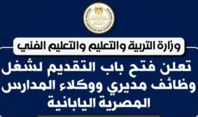 في إطار تنفيذ تكليفات القيادة السياسية بمواصلة التوسع في نموذج المدارس المصرية اليابانية، وتعزيز الكوادر القيادية الداعمة لهذا النموذج التعليمي المتميز، أعلنت وزارة التربية والتعليم والتعليم الفني فتح باب التقديم لشغل وظائف مديرين ووكلاء بالمدارس المصرية اليابانية، وذلك تزامنًا مع التوسع في أعداد المدارس ودخول مدارس جديدة الخدمة خلال العام الدراسي المقبل.