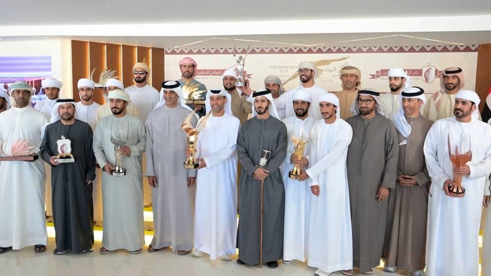 توج الفائزين الشيخ زايد بن حمد بن حمدان آل نهيان، نائب رئيس الاتحاد الدولي لرياضات وسباقات الصقور، نائب رئيس اتحاد الإمارات للصقور، بحضور فارس خلف المزروعي، رئيس هيئة أبوظبي للتراث، رئيس مجلس إدارة نادي أبوظبي للصقارين.