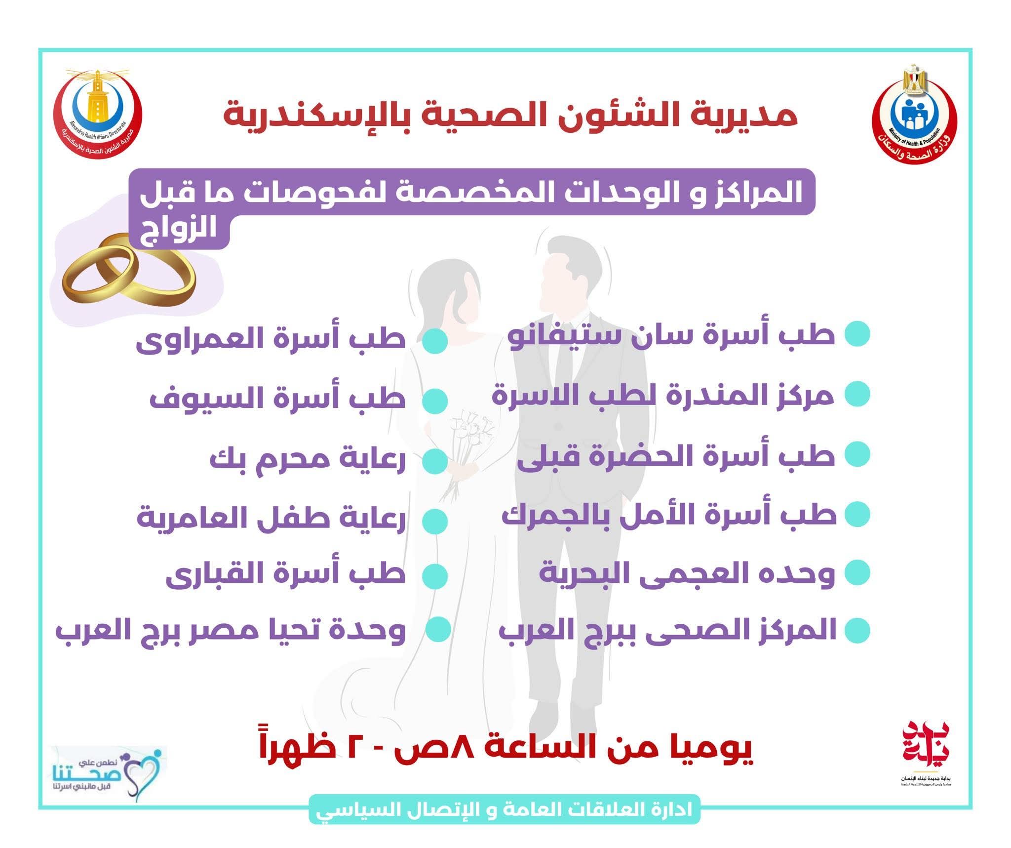 أعلنت محافظة الإسكندرية ، عن أماكن و مواعيد العمل في الوحدات الصحية التي تقدم خدمات الفحص للمقبلين على الزواج بمحافظة الإسكندرية