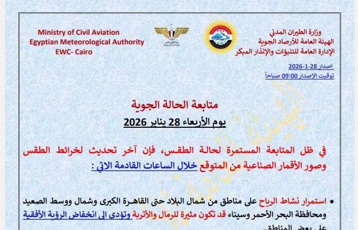 - استمرار نشاط الرياح على مناطق من شمال البلاد حتى القاهرة الكبرى وشمال ووسط الصعيد ومحافظة البحر الأحمر وسيناء قد تكون مثيرة للرمال والأتربة وتؤدي إلى انخفاض الرؤية الأفقية على بعض المناطق.