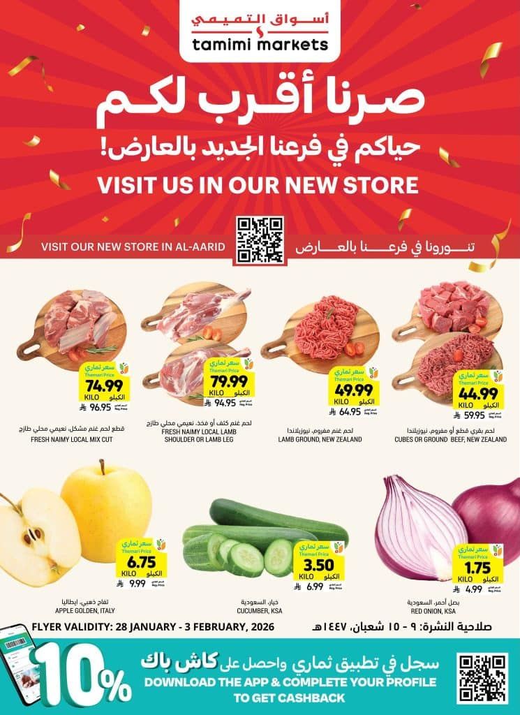 عروض التميمي الرياض الخميس 29-1-2026 الموافق 10 شعبان 1447هـ و تحتوي علي شكيلة واسعة من اللحوم الطازجة كالغنم النعيمي المحلي والمفروم البقري النيوزيلندي إلى جانب الخضروات والفواكه الأساسية مثل البصل الأحمر والخيار والتفاح الإيطالي كما تشمل سلع تموينية متنوعة من زيوت الزيتون ودوار الشمس والمعكرونة