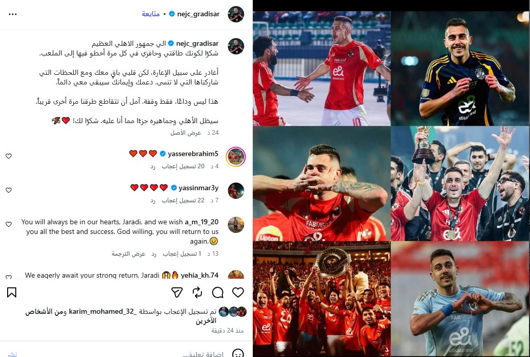 وتفاعل عدد كبير من جماهير الأهلي مع رسالة جراديشار، معبرين عن تقديرهم لمشاعره الصادقة، ومتمنين له التوفيق في تجربته الجديدة، على أمل عودته مجددًا بقميص الأهلي في المستقبل القريب.