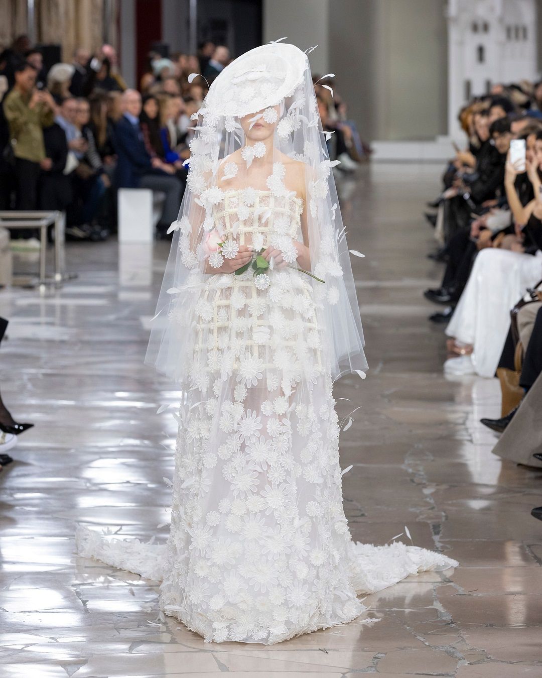 للعروس التي تعشق البساطة الراقية، قدّم جورج شقرا فستان زفاف يميل إلى الطابع الفرنسي الكلاسيكي. التصميم جاء بقصّة هندسية على شكل مربعات تشبه القفص الذهبي، زُيّن لاحقًا بتطريزات الورود الناعمة. أما طرحة الدانتيل المزينة بالريش، مع قبعة مائلة من الدانتيل، فأضفت لمسة شاعرية حالمة تليق بأجواء الهوت كوتور الباريسي.