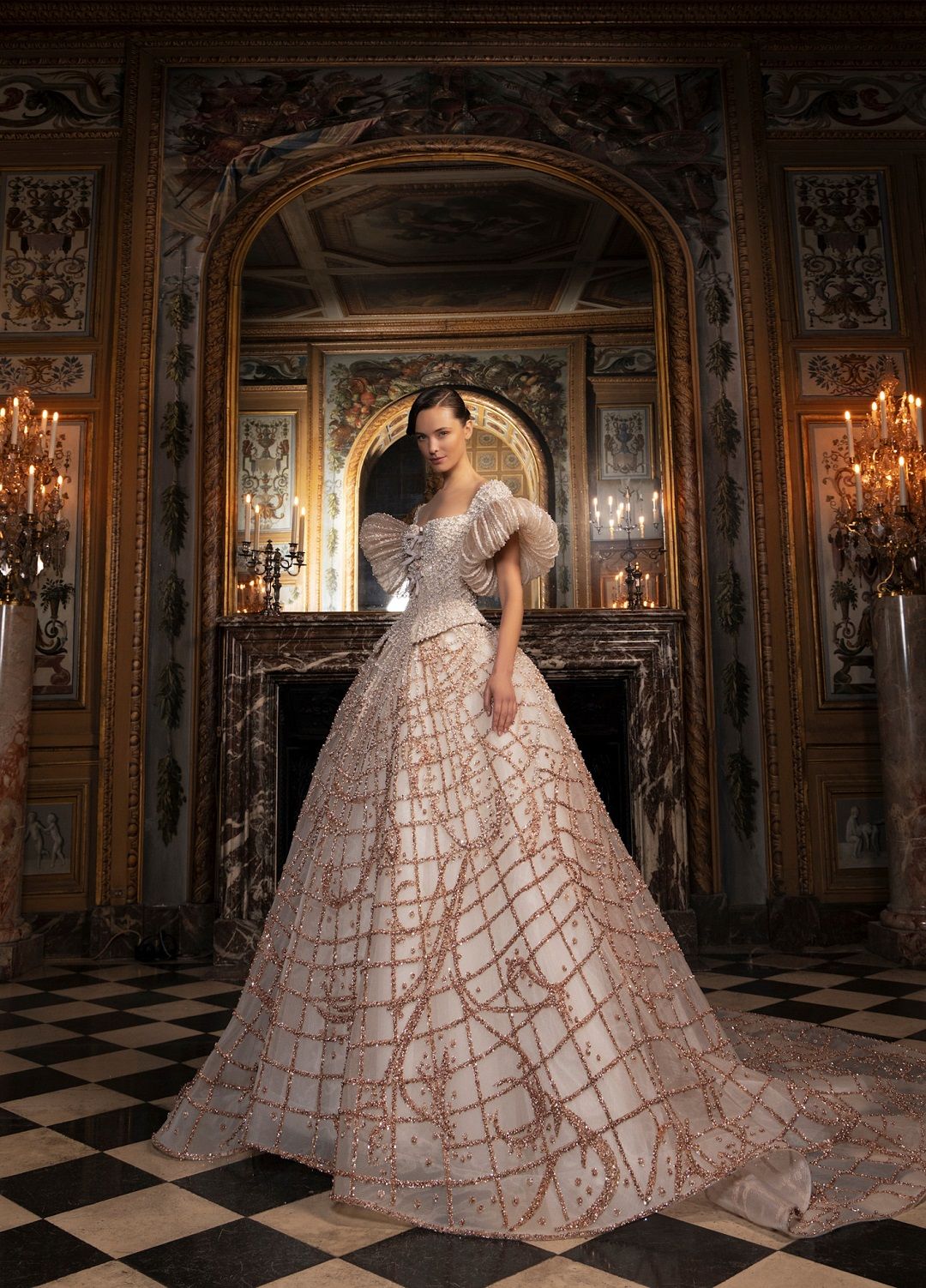قدّم المصمم زياد نكد فستان زفاف وكأنه خارج من عالم الأساطير، حيث اعتمد على قصّة كورساج أنثوية تبرز الخصر، تنسدل بعدها تنورة منفوشة بقصّة السندريلا الكلاسيكية. الأكمام المنفوشة جاءت بطريقة دراماتيكية حالمة، بينما أضفت التطريزات النحاسية الفاخرة طابعًا ملكيًا على التصميم، لفستان مثالي للعروس الرومانسية التي تحلم بإطلالة تشبه حكايات الخيال في يومها الكبير.