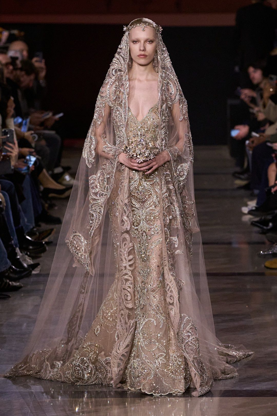 كالعادة، حمل توقيع إيلي صعب طابع الدراما والرومانسية الخالدة. الفستان جاء بقصّة حورية البحر، ليبرز قوام المرأة بطريقة أنثوية راقية. التطريز الكامل بالخرز الذهبي النحاسي منح التصميم بريقًا فخمًا، بينما انسدلت الطرحة الطويلة على كلا الجانبين، مزينة بخيوط ذهبية من الأطراف، لتجسد مفهوم العروس الملكة في أسبوع الموضة في باريس ربيع 2026.