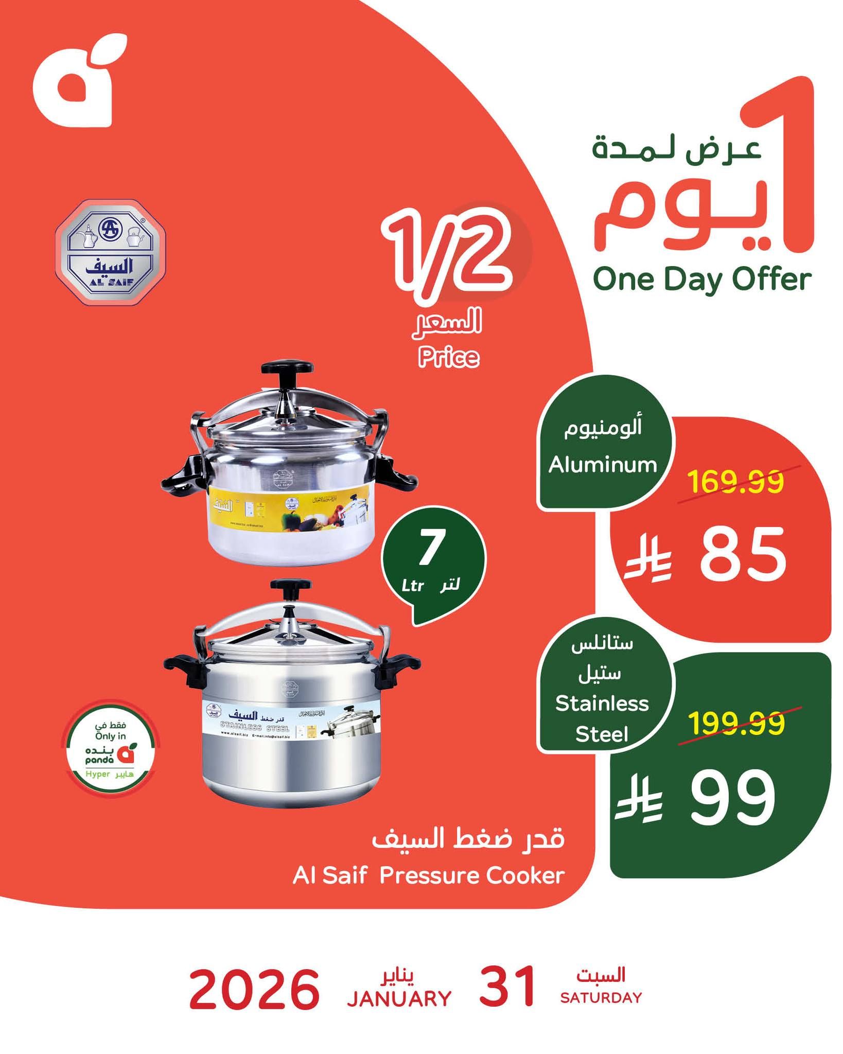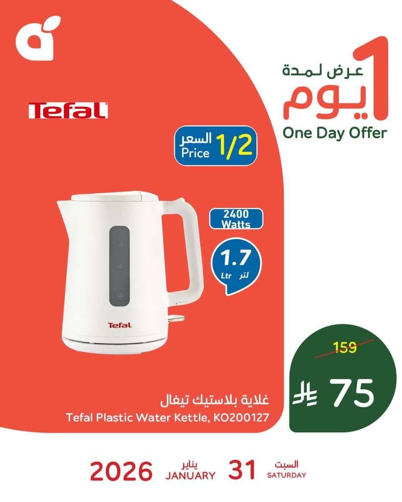 بنده السبت 31 يناير 2026 الموافق 11 شعبان 1447هـ و تحتوي علي افضل الاجهزة المنزلية و الضرورية منها غلاية بلاستيك تيفال و ايضا بتوفر اقوي الادوات المنزلية من قدر الضغط السيف في عرض حصري متاح اليوم فقط و بنصف السعر لا تفوت الفرصة و تسوق عروض بنده اليوم ووفر .