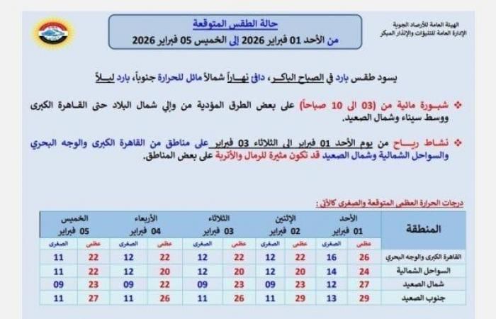 وتستعرض «الأسبوع» لمتابعيها حالة الطقس خلال الأيام المقبلة من 1 فبراير حتى الخميس 5 فبراير 2026، وذلك ضمن خدمة مستمرة تحرص على تقديمها لزوارها من هنا.