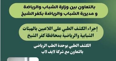 أعلنت مديرية الشباب والرياضة بكفر الشيخ، عن فتح باب الحجز لإجراء الكشف الطبي على اللاعبين بالهيئات الشبابية والرياضية، بوحدة الطب الرياضي ابتداءً من يوم الإثنين المقبل، 2 فبراير2026، بالتعاون مع وزارة الشباب والرياضة "الإدارة المركزية للطب الرياضي، الإدارة العامة لشؤون الوحدات والمراكز الطبية" وفق قرار الدكتور أشرف صبحي الشباب والرياضة، الخاص بتخفيض التكاليف المالية الخاصة بإجراءات الكشف الطبي والكود الطبي للرياضيين بوحدات الطب الرياضي التابعة للوزارة في المحافظات، للتخفيف عن كاهل اللاعبين والأندية والهيئات الرياضية .