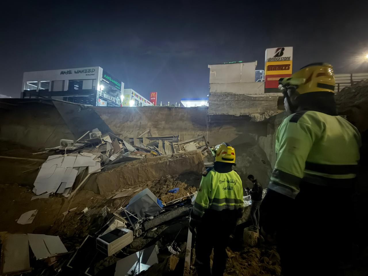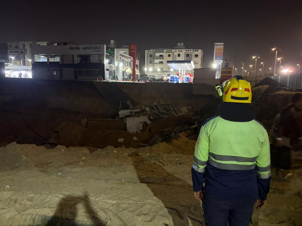 وبالانتقال والفحص، تبين حدوث هبوط أرضي داخل محطة وقود موبايل بعمق (15) مترا مما أسفر عن انهيار كامل لمحل لبيع الورد ومحل لبيع الحلويات داخل المحطة، كما نتج عن الحادث إصابة شخصين وتم نقلهما للمستشفى.