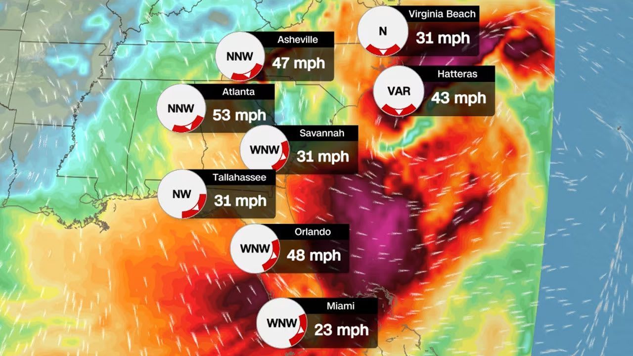 وتنتشر هبات رياح تتراوح سرعتها بين 40 و55 ميلاً في الساعة في جميع أنحاء جنوب شرق البلاد، وستستمر حتى الأحد. وستشتد الرياح على طول الساحل، وقد تصل سرعتها إلى 70 ميلاً في الساعة في جزر أوتر بانكس بولاية كارولاينا الشمالية.