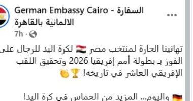 الأحد، 01 فبراير 2026 07:08 مهنأت سفارة ألمانيا بالقاهرة منتخب مصر لكرة اليد للرجال، بمناسبة فوزه ببطولة الأمم الأفريقية 2026، وتحقيقه اللقب القاري العاشر في تاريخه، والرابع على التوالي.