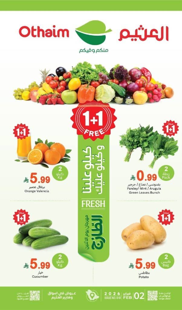 احدث عروض العثيم الاثنين 2 فبراير 2026 الموافق 14-8-1447هـ تحتوي علي الجبن الأبيض والجبن الموزاريلا واللحم المفروم من غرينلاند واللحم المقطع والسمك المجمد والزيتون الأسود والدجاج و بتوفر كمان عروض اسواق العثيم الفواكه والخضروات الطازجة منها الكيوي والموز والتفاح الأحمر والبرقوق الأحمر والخوخ والأناناس والكرنب باسعار مميزة