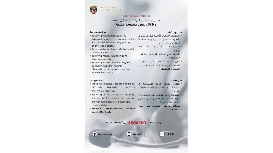 أطلق جهاز أمن الدولة خدمة (SSD) لتلقي البلاغات الأمنية، حيث تتضمن مسؤولياتها، استقبال البلاغات الأمنية عن أي نشاط متطرف، أو تصرف مشبوه، يهدد سلامة الأفراد وأمن المجتمع، والتعامل مع بلاغات الإساءة للدولة ورموزها، التعامل مع بلاغات التجسس وإفشاء المعلومات، وتلقي بلاغات التهديدات والسلوكيات السلبية، وأي ملاحظات أمنية تؤثر في الاستقرار المجتمعي، بينما تشمل التزاماتها إعطاء الحرية التامة لمشاركة أي معلومات، أو ملاحظات، أو اشتباه يتطلب الانتباه، واستقبال جميع البلاغات دون الكشف عن هوية المُبلّغ، مع ضمان أعلى معايير الخصوصية والسرية.