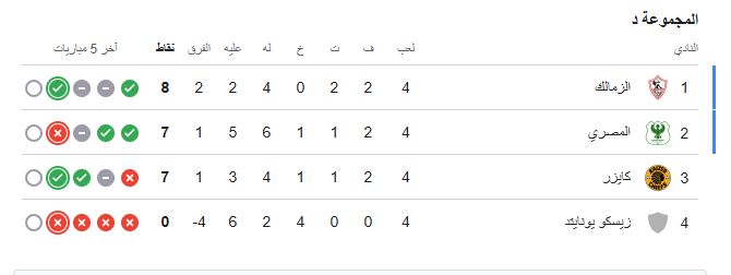 ويتصدر فريق الزمالك المجموعة الرابعة بكأس الكونفدرالية الأفريقية برصيد 8 نقاط، وتراجع المصري للمركز الثاني برصيد 7 نقاط، ويليه كايزر تشيفز الجنوب أفريقي في المركز الثالث برصيد 7 نقاط أيضاً، ويأتي زيسكو يونايتد الزامبي في المركز الرابع والأخير برصيد نقطة واحدة.