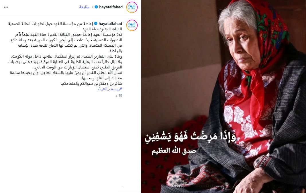 وجاء في بيان المؤسس: "تود مؤسسة الفهد إعلام جمهور الفنانة القديرة حياة الفهد بآخر المستجدات الصحية، حيث عادت إلى أرض الكويت بعد رحلة علاج في المملكة المتحدة لم تُكلل بالنجاح نتيجة شدة الإصابة بالجلطة، ووفقاً للتقارير الطبية تقرر استكمال علاجها داخل الكويت، ولا تزال تتلقى الرعاية الطبية في العناية المركزة، ووفق توصيات الفريق الطبي، يُمنع استقبال الزيارات في الوقت الحالي، نسأل الله العلي القدير أن يمنّ عليها بالشفاء العاجل، وأن يعيدها سالمة معافاة إلى أهلها ومحبيها، شاكرين ومقدّرين دعواتكم واهتمامكم".