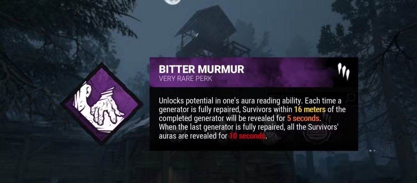 يوفر Perk Bitter Murmur أداة معلومات قوية تساعد The Mastermind على تتبع تحركات الناجين حيث يتم كشف مواقعهم عند إكمال كل مولد قريب كما يتم كشف جميع مواقعهم لفترة أطول بعد تشغيل المولد الأخير مما يعزز السيطرة في المراحل الحاسمة من المباراة.
